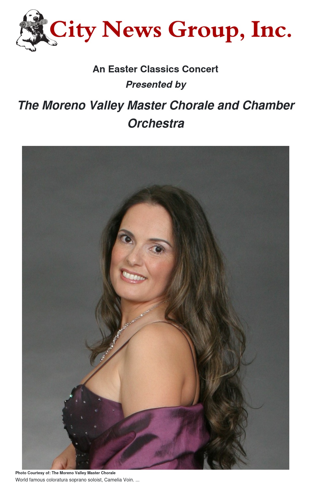 This concert, directed by Dr. Viorel Gheorghe, will feature soloist Camelia Voin, an acclaimed lyric coloratura soprano who has performed throughout the United States and abroad as an operatic, oratorio, and recital soloist. She has appeared in recitals and opera productions on some of the world’s most important stages, including Carnegie Hall in New York, Teatro la Fenice in Venice, Dorothy Chandler Pavilion in Los Angeles, and the Romanian National Opera in Bucharest. She will be joining the Chorale while singing the solos in Pergolesi’s Stabat Mater; Cesar Franck’s Panis Angelicus; and the beautiful Bist du bei mir by Stölzel - Bach, as arranged by Dr. Gheorghe for orchestra.