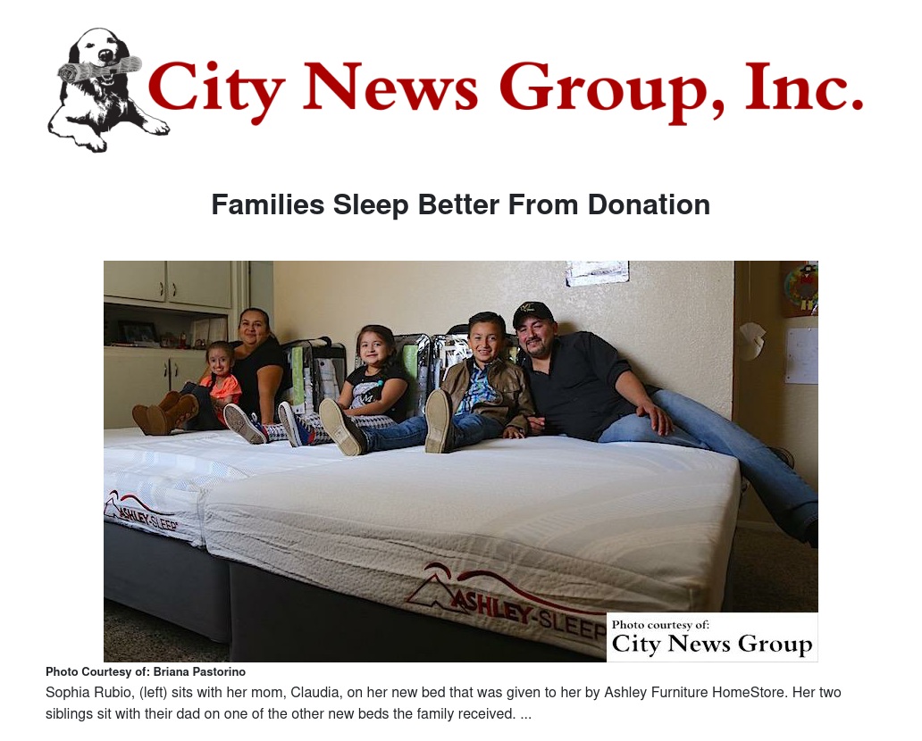 “It is the hope of Ashley Furniture that every child around the world has a clean, unused mattress set to call their own,” said Kurt Haines, senior vice president, Ashley Furniture HomeStore. “We appreciate the efforts of Loma Linda University Children’s Hospital to assist us in our efforts to make that possible. Because of them, 11 kids now have a bed to call their own.”