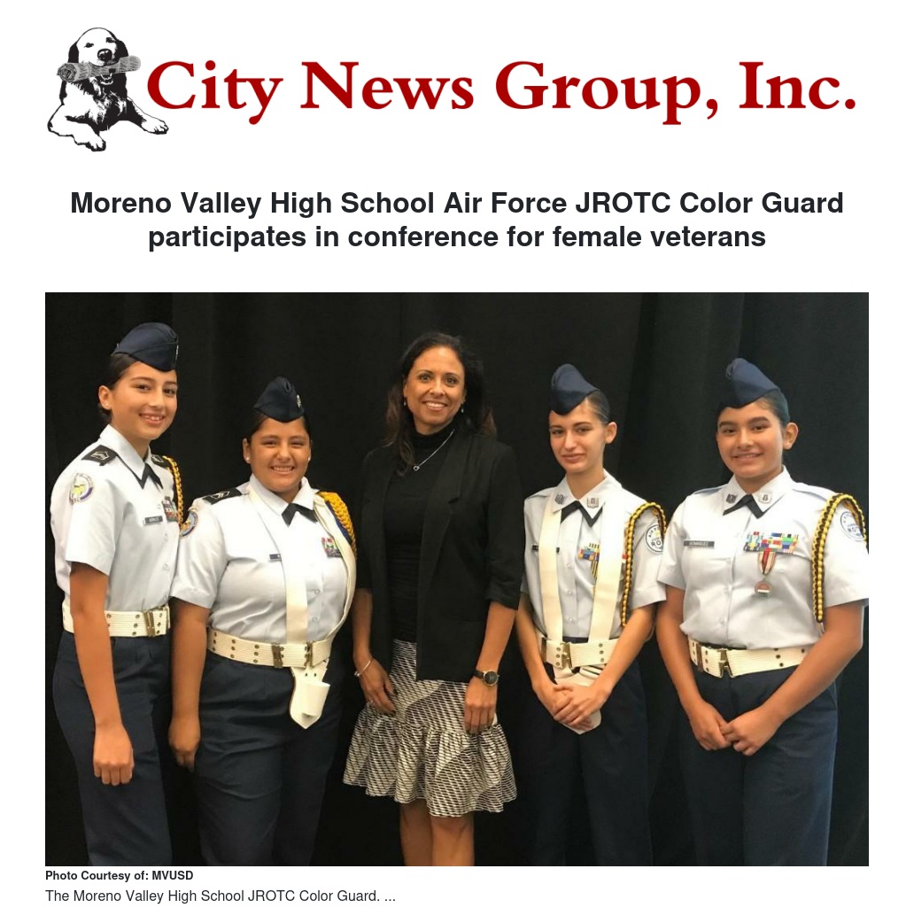 On Saturday, October 21st, 2017, the Moreno Valley High School Air Force JROTC Color Guard presented the Colors at a conference held especially for Female Veterans, which took place at the Moreno Valley Conference Center. The four-person team consisted of Cadet Casandra Ramirez commanding, Cadet Holly Trojanowski, Cadet Vanessa Morales, and Cadet Imelda Dominguez.
