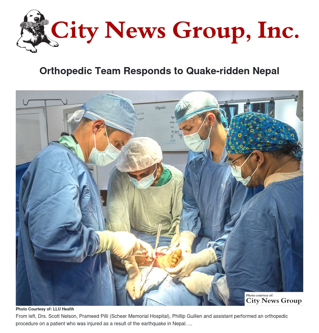 Loma Linda University Health deployed an orthopedic surgical team to quake-ridden Nepal on Wednesday, May 6. The six-person team consists of two orthopedic surgeons, an anesthesiologist, an OR scrub tech, an orthopedic resident, and a logistics and support person, working on site at Scheer Memorial Hospital of Seventh-day Adventists.