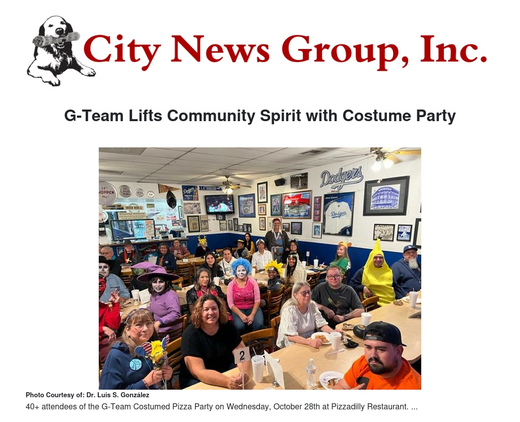 About 45 people joined Dr. G to enjoy the positive vibe “in costume”, and celebrate family, friends, and the community. “This was a nice event,” said Yaneth Murillo who brought her children to join in on the fun, and continued, ”my kids had a great time.” The event was held at Pizzadilly Restaurant @ 194 East Valley Blvd, and owner Raymond Dorado, was a gracious host, along with his staff, Gloria (sister) and Denise (niece).