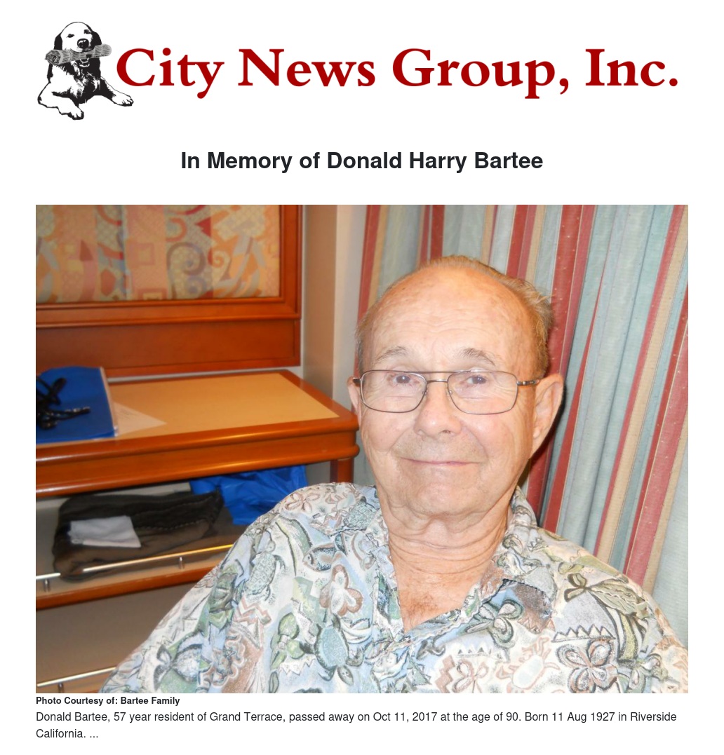 57 year resident of Grand Terrace, passed away on Oct 11, 2017 at the age of 90. Born 11 Aug 1927 in Riverside California. Don graduated from Riverside Poly High School in 1945 and served in the Navy at the end of WWII.