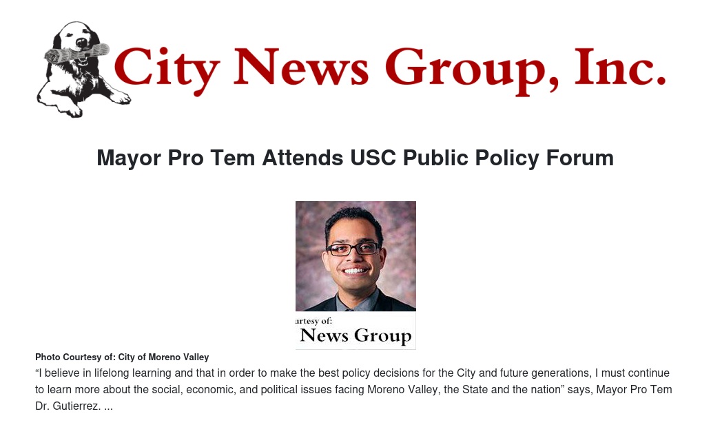 Moreno Valley’s Mayor Pro Tem Dr. Yxstian Gutierrez attended USC’s Sol Price School of Public Policy Executive Education Forum to further develop his understanding of current public issues and provide keen leadership and policy direction for the betterment of Moreno Valley.