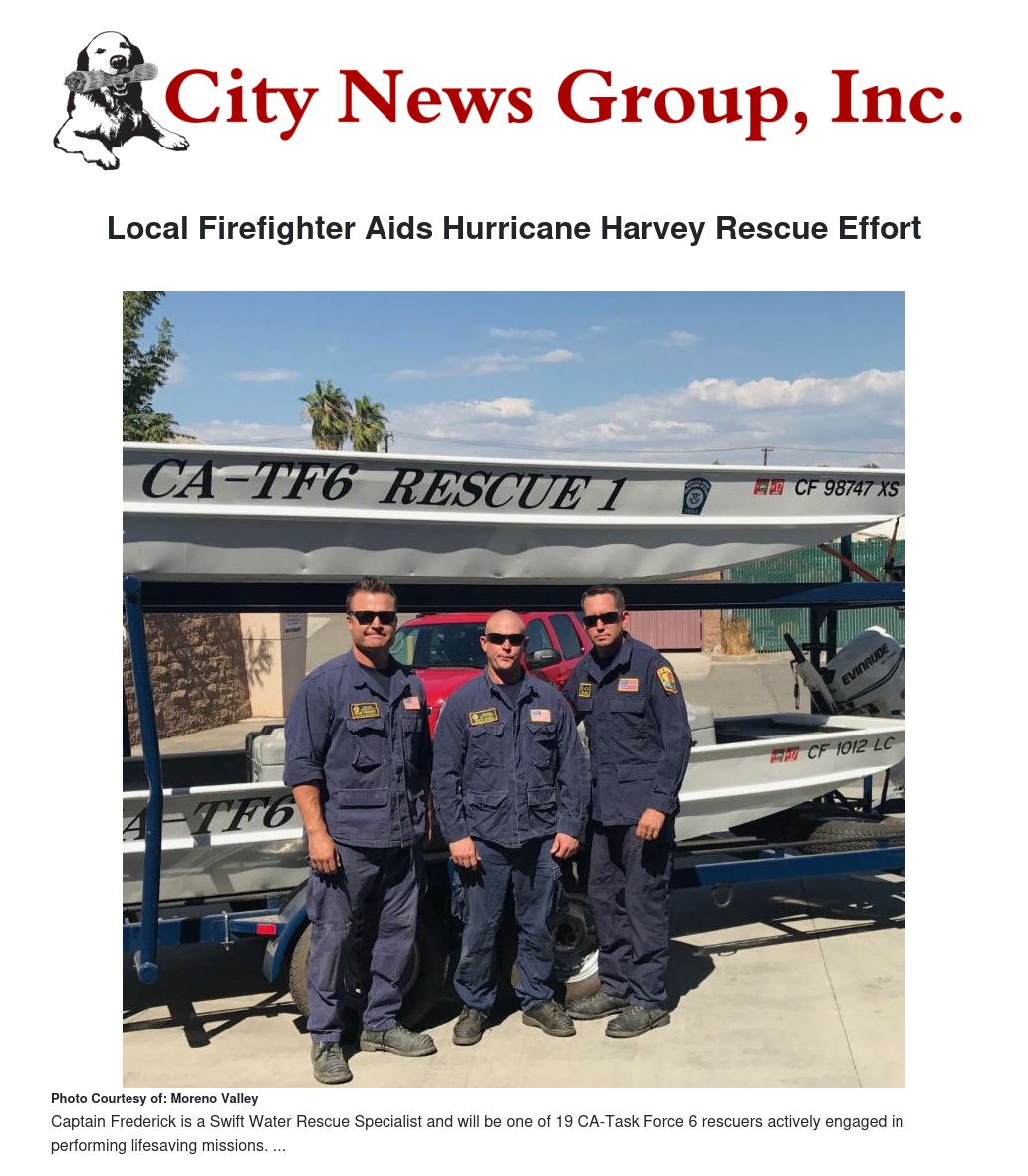 Moreno Valley Fire Captain Shane Frederick, who is assigned to Fire Station 2 (Sunnymead), has been deployed to Texas to assist with rescue and recovery efforts related to Hurricane Harvey.