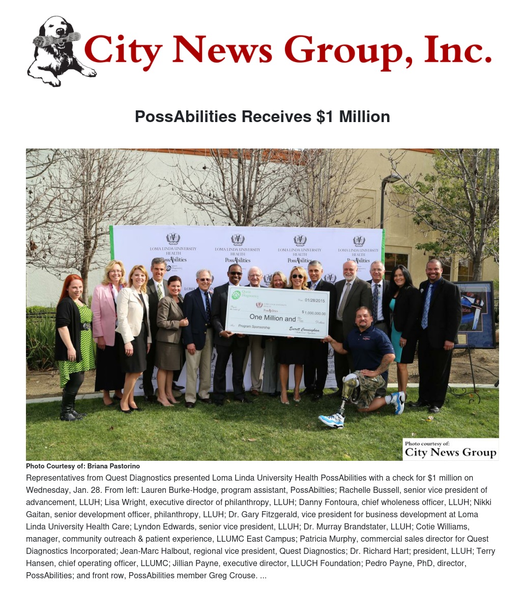 Loma Linda University Health (LLUH) PossAbilities was presented with a check on Wednesday, Jan. 28 for $1 million from its new title sponsor, Quest Diagnostics, a provider of diagnostic testing, information and services.