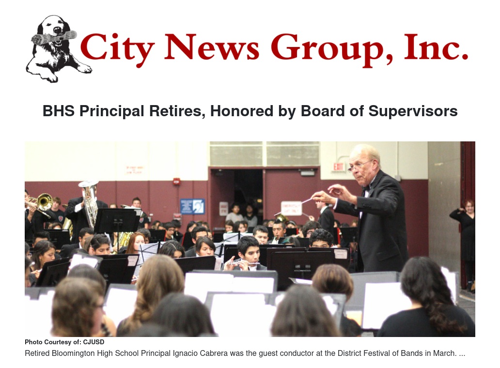 Former Bloomington High School (BHS) principal Ignacio Cabrera retired from his 15-year tenure—13 of which he spent as principal—with the Colton Joint Unified School District (CJUSD), leaving Bloomington High School in the number-one rank in the district for both graduation and attendance rates, at 89.6 percent and 95 percent, respectively, according to a release issued by San Bernardino County Supervisor Josie Gonzales’s office.