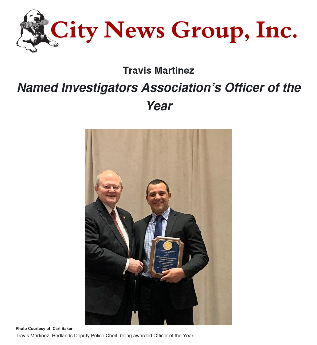 Redlands Deputy Police Chief Travis Martinez was honored as Officer of the Year by the California Robbery Investigators Association at the organization’s 50th Annual Conference, held Feb. 16 in Reno, Nev.