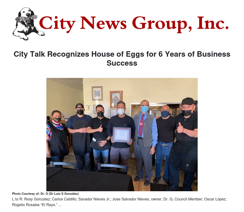Salvador Nieves and his family are to be congratulated for their business success and continued strong standing in the community. Located at 182 East Valley Blvd, House of Eggs is open every day 7:00 am – 2:00 pm, and there is always a fresh pot of coffee waiting. Stop by and have breakfast – you won’t be disappointed.
