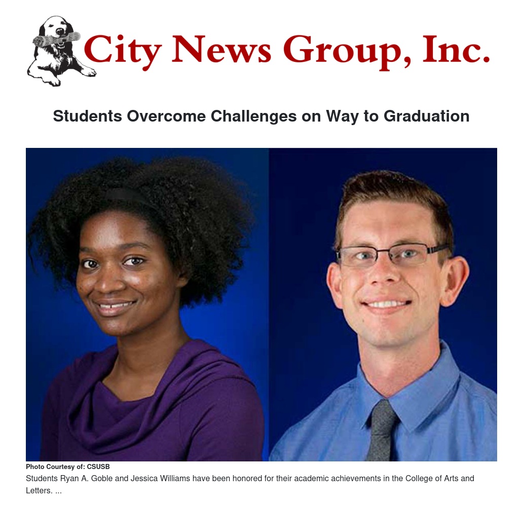 Students Ryan A. Goble and Jessica Williams have been honored for their academic achievements in the College of Arts and Letters. Goble received a master’s in English composition, with a concentration in applied linguistics and teaching English as a second language. A resident of Fontana, Goble cites Caroline Vickers, professor of linguistics in CSUSB’s English department, as his inspiration for pursuing a master’s degree in the field, showing him how powerful language is and why it is important to study.