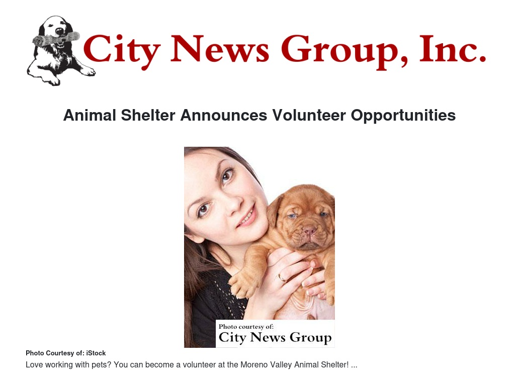 Opportunities are currently available for members of the community to assist staff at the Moreno Valley Animal Shelter as they care for shelter animals and promote pet adoptions.
