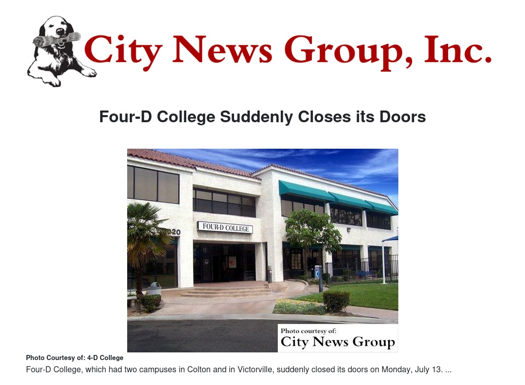 Four-D College’s Colton campus was accredited in 1996 and its Victorville campus in 2006. It was a private Christian college providing courses on licensed vocational nursing and other health care programs.
