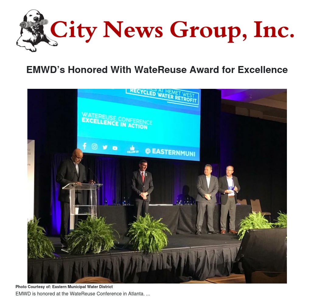EMWD received the award at the WateReuse Symposium in Atlanta. The awards recognize individuals and projects that have made significant contributions in support of greater adoption of recycled water usage.