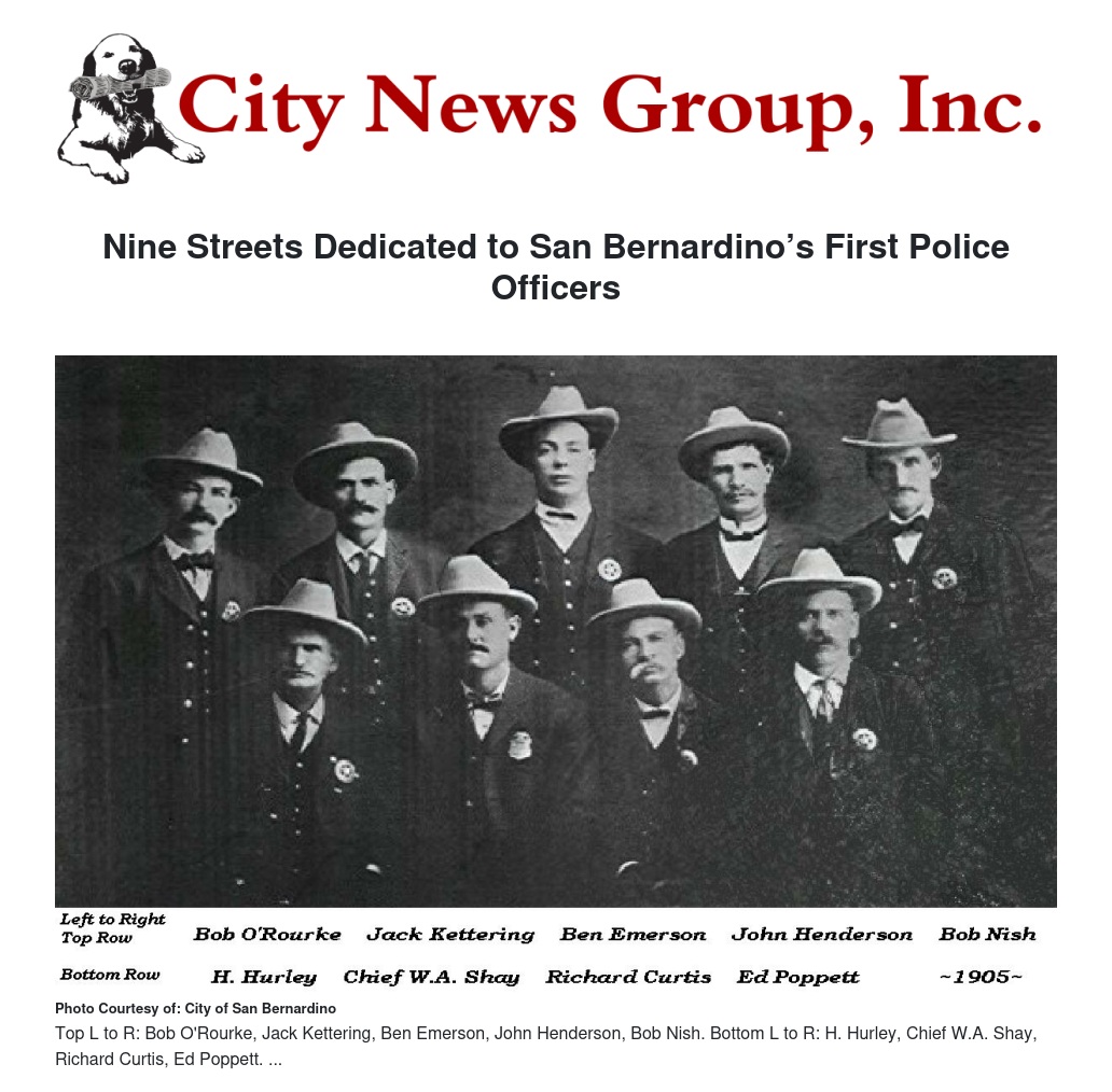 The original San Bernardino police officers who took office on May 15, 1905, were John Bell Kettering, Robert O’Rourke, John A. Henderson, William Hurley, Edward Poppett, Benjamin Emerson, Richard Curtis, Robert Nish and Chief Walter Shay Jr.