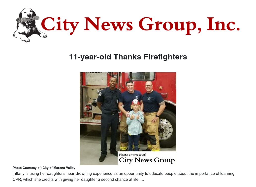 MORENO VALLEY>> Eleven-year-old Ally Hatch and her family visited firefighters at Moreno Valley Fire Station 91 this week to thank them for helping save her life after she nearly drowned in her grandparents' swimming pool.