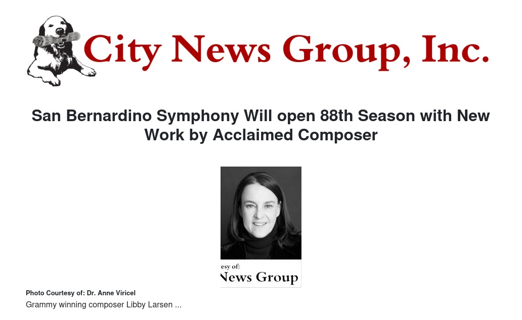 San Bernardino Symphony Music Director and Conductor Frank Paul Fetta was thrilled to hear the latest news about Grammy winning composer Libby Larsen, who has been commissioned to write a new work to be premiered at the orchestra’s 88th Season opening concert this-coming October.