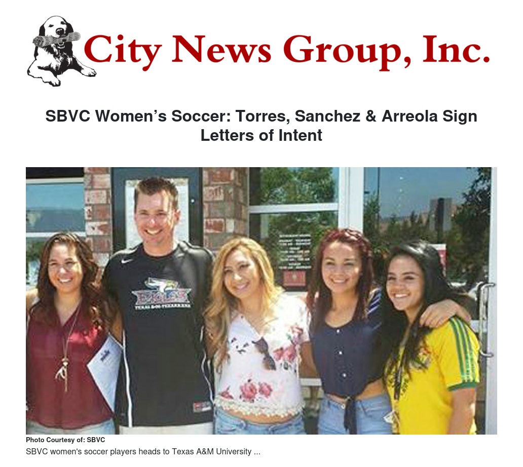 SBVC Women’s Soccer goal keeper Vanessa Sanchez (Desert Hot Springs H.S.), forward Jenavee Arreola (San Jacinto H.S.) and midfielder Sheila Torres (Redlands East Valley) have all signed letters of intent to play for Texas A&M University–Texarkana next season.