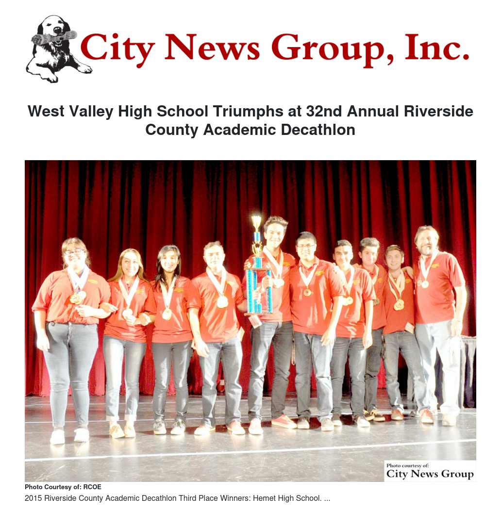 West Valley High School emerged victorious at the 2015 Riverside County Academic Decathlon on Saturday, Feb. 7. Students from 19 high school teams were honored following the final competition that included the Super Quiz held at Heritage High School.