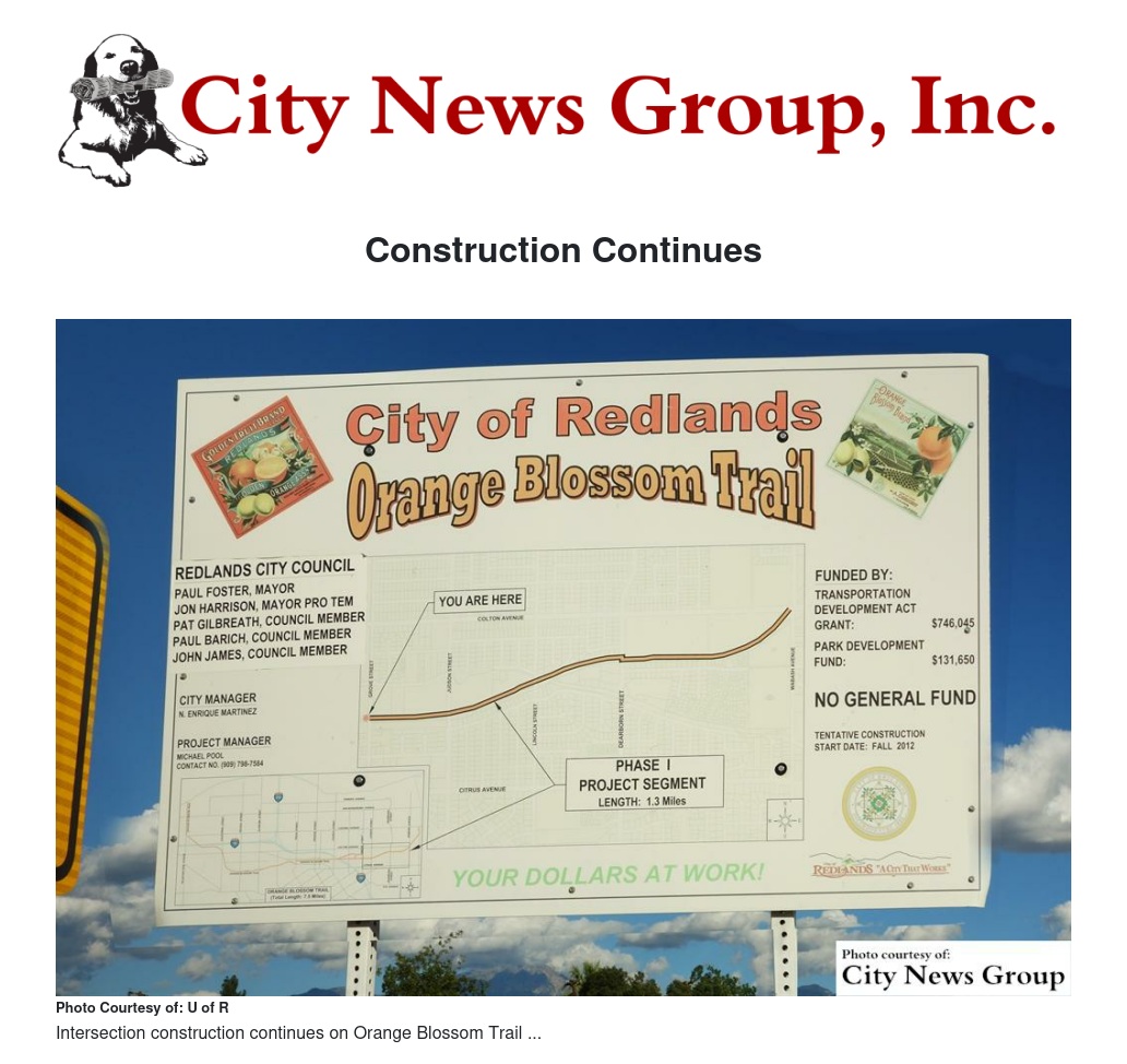 The Orange Blossom Trail Phase II project is managed by the City of Redlands Municipal Utilities and Engineering Department. The City will make a concerted effort to minimize disruptions for residents and businesses in the project area. Traffic control may be installed in the area during construction but is anticipated to be removed daily. Work is anticipated between the hours of 7 a.m. and 5 p.m., Monday through Friday.