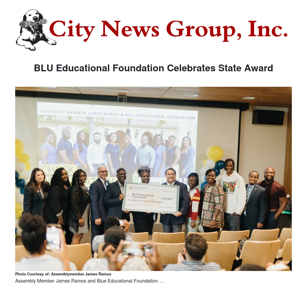 Assemblymember James C. Ramos (D-Highland) today presented a symbolic check of $5 million to BLU Educational Services/ Foundation to expand the organization’s College Exodus Project aimed at helping at-risk students attend and graduate from college. He presented the check to Chief Executive Officer Dina Walker as well as BLU students.