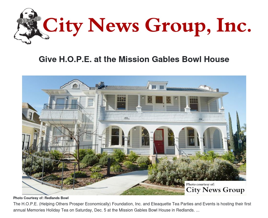 The H.O.P.E. (Helping Others Prosper Economically) Foundation, Inc. and Eteaquette Tea Parties and Events is hosting their first annual Memories Holiday Tea on Saturday, Dec. 5 at the Mission Gables Bowl House in Redlands.
