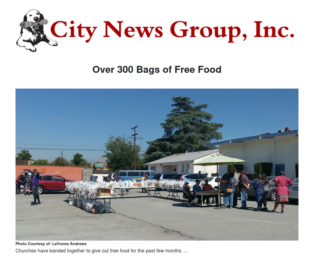 Three churches sharing one building have come together for the last two months to give away free food and other items at the Inland Empire Center for Spiritual Living on Golden Avenue in San Bernardino, CA. The event has been held the last Thursday of each month on a trial basis for three months.