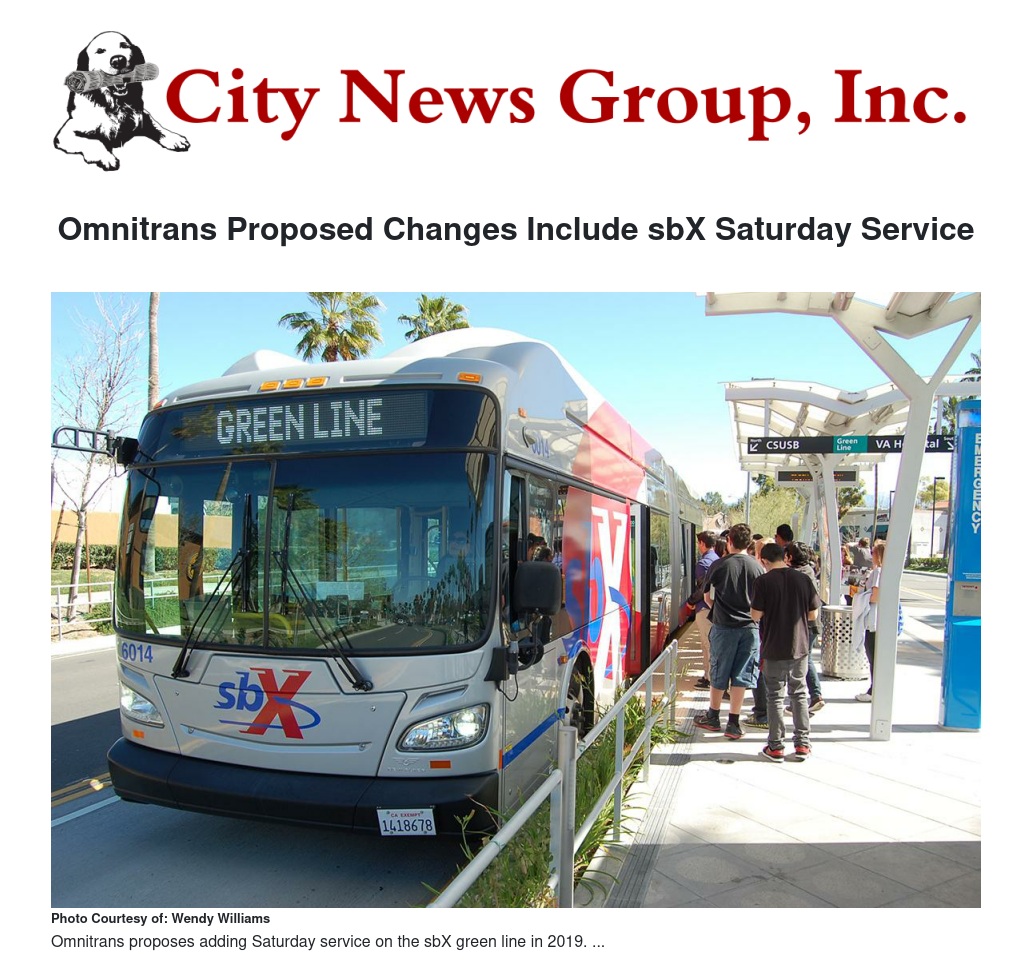 The sbX bus rapid transit line serving Loma Linda and San Bernardino launched in 2014 as a weekday-only service with 60-foot articulated buses running every 10 to 15 minutes. Omnitrans proposes to add Saturday service in January 2019, with sbX vehicles operating every 20 minutes from 7am to 8pm.