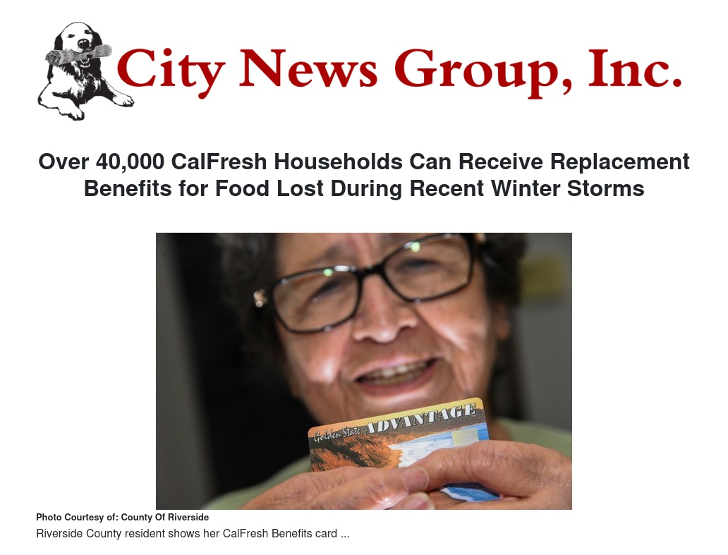 To report the loss of food purchased with CalFresh benefits during the recent winter storms, Riverside County residents can call 1-877-410-8827, visit their nearest DPSS office, or go online at BenefitsCal.com. When completing their form, CalFresh customers should include their contact information, a short description of how the food was lost, and the time and date when the loss occurred.