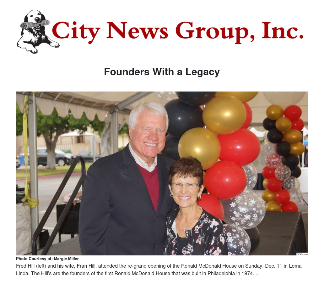 LOMA LINDA>> Fred Hill was drafted by the Philadelphia Eagles as their starting tight end and during the fourth year of his professional career, he made it through training camp for the first time without an injury. He was leading the team in pass receiving. He must have felt on top of the world. But during the last preseason game another player from the opposing team “leg whipped” him and totally ripped his knee out. “That was the end of the good times,” said Hill. “Here 3,000 miles from home, I couldn’t play. Then all of a sudden we got the worst news of our life.” No, he wasn’t fired. It was worse much worse and they were shattered. Their 3-year-old daughter was diagnosed with leukemia. Leonard Tose is the owner of the Philadelphia Eagles. When he found out that his daughter, Kim, was sick, he called Fred into his office and said “just tell me what you need.” “Then he told us, we want to have a fundraiser, you know, with the Eagle ball players. I want you to do this at my club at the stadium except Mr. Tose used profanity, he always did,” Hill said. The Ronald McDonald House is a home away from home for families with critically ill children staying at nearby children’s hospitals or other pediatric facilities. The philosophy is keeping families close. The number one stress that we see outside of the severity of their child being sick would be the other children at home. And if your child has siblings, you are not in a sterile hospital situation. The siblings are playing video games, they have toys outside and you’re in a home. It’s so wonderful to see these families being helped because there’s so many of these kids that do so much better just because their parents are with them at the hospital. A lot of times, there is not a major treatment hospital close to their home so they have to go far away like Loma Linda Children’s Hospital. While the hospital staff is taking care of the child, so many times the family is forgotten about. Where is the family going to have dinner? Where are they going to have a hot shower? Where are they going to get a good night’s rest? If the family is not rested, they may not be the advocate for their child. So the social worker steps in and they say “you know we have this lovely facility across the street for you; it’s called the Ronald McDonald House and they’re going to be able to help you.” They have a place to sleep; they have a place to pray; they have food. You’re walking distance to the hospital. They have other people going through the same thing. Ronald McDonald House provides such a benefit and that is why they are needed and that is why they are going all over the world. “We formed Eagles fly for Leukemia,” Hill said. “It was great, the whole team showed up and as the money came in it was put up on the scoreboard. We raised about $125,000. But that was just the start because then the word was getting out. Ed Ramsey, who was the regional manager of McDonalds, saw what we were doing and said “you know what? This is such a great thing, we want to help. They had a big green shake promotion for St. Patrick’s Day and he said we’ll give you 25 cents on every green shake we sell. We will pay for the house if you let us call it the Ronald McDonald House. We said you can call it hamburger heaven just give us the money and they did. And they actually paid for that first house. And that is what started everything off; in 1974 - one house, in 1977 - two houses, in 1979 – ten, and then from there it just took off. Kim was the inspiration but I totally know God touched the hearts of all these people that jumped in and wanted to help.” Fred and Fran are definitely salt of the earth and they always wanted to help and to give back. Ronald McDonald House is a global charity and it all started with Fred and Fran. Each community owns its own Ronald McDonald house and approximately 15 percent of its annual budget is supported by Ronald McDonald. If you would like to help or get involved, call 909-747-1275. Ronald McDonald House logo