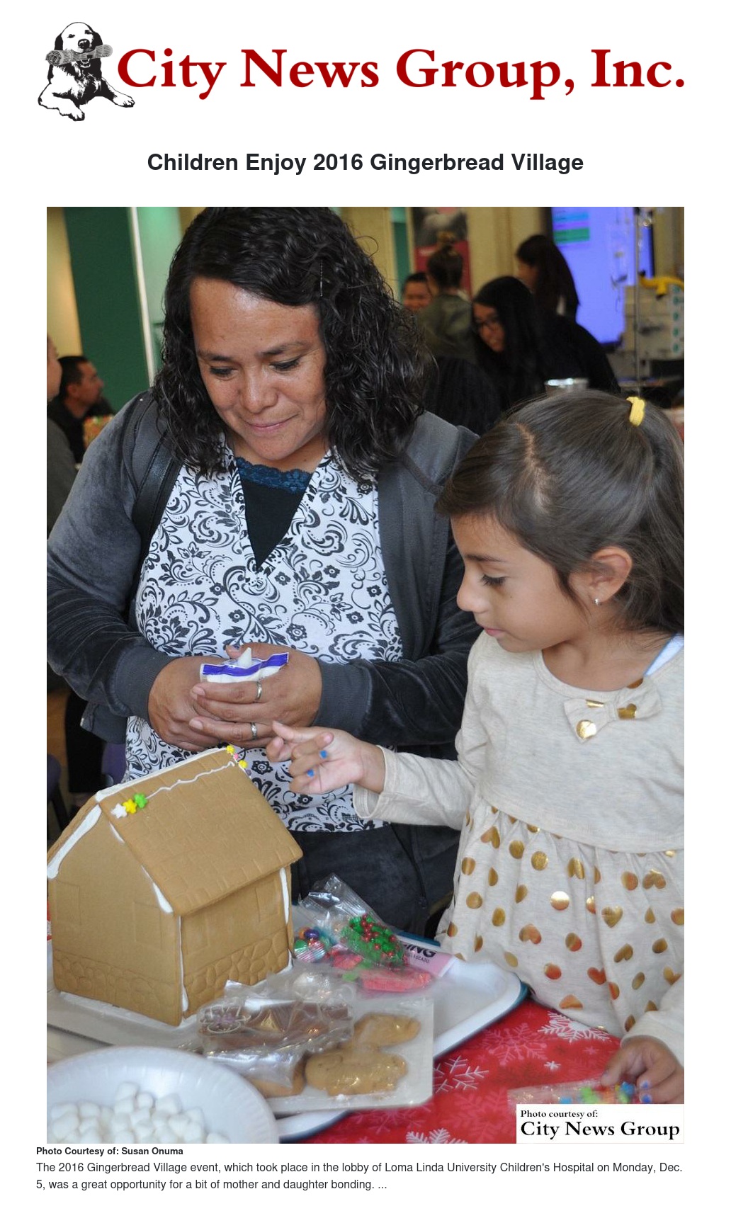 LOMA LINDA>> The lobby of Loma Linda University Children’s Hospital is abuzz with activity. Children cluster around five circular tables to pursue the infinitely serious business of expressing their creativity on the walls of their personal gingerbread houses. Santa grins his way from table to table, offering high fives and ho-ho-hos, as dozens of volunteers—members of the Big Hearts for Little Hearts Loma Linda Guild—mingle with the kids, making sure they have plenty of candies and frosting to decorate the colorful, miniature abodes.