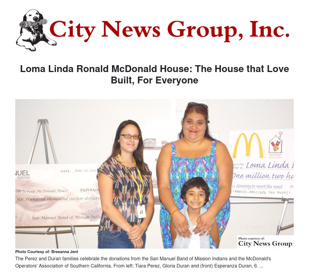 The San Manuel Band of Mission Indians and the McDonald's Operators' Association of Southern California were two large donors recognized by the Loma Linda Ronald McDonald House that day for their respective $5.6 million and $1.25 million donations to the House for its "Growing to Meet the Need" campaign, a philanthropic effort to raise $12 million total to expand the house by more than double its size.