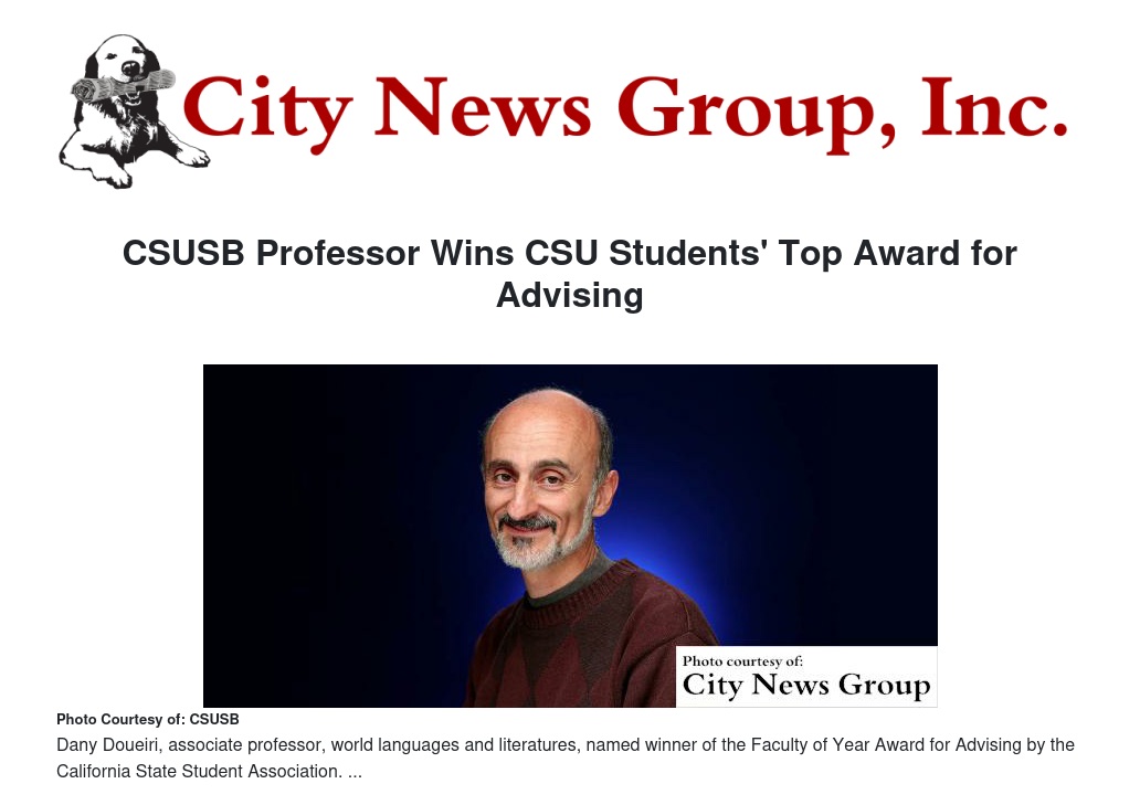 Dany Doueiri, an assistant professor and coordinator of the Arabic Language Program at Cal State San Bernardino, was named the 2015-2016 winner of the Faculty of Year Award for Advising by the California State Student Association.