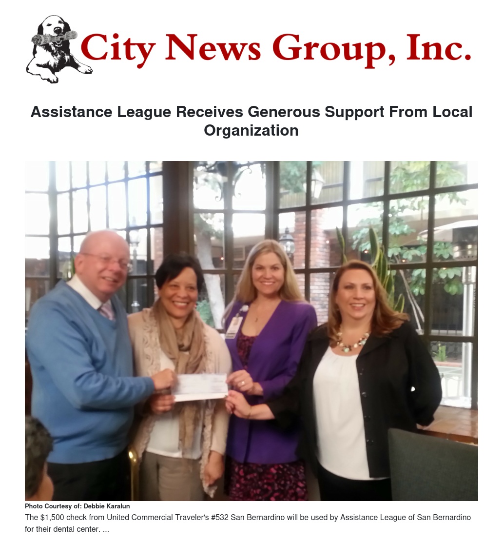 Dennis Baxter, vice president of United Commercial Traveler's #532 San Bernardino, presented the Assistance League of San Bernardino's President Denise McCrary-Brewster, Dr. Earl R. Crane Children's Dental Health Center Co-chair Margie Arnett, and Assistance League of San Bernardino's President-elect Debbie Karalun a check for $1,500 for their dental center on Jan. 8 at the San Bernardino Hilton.