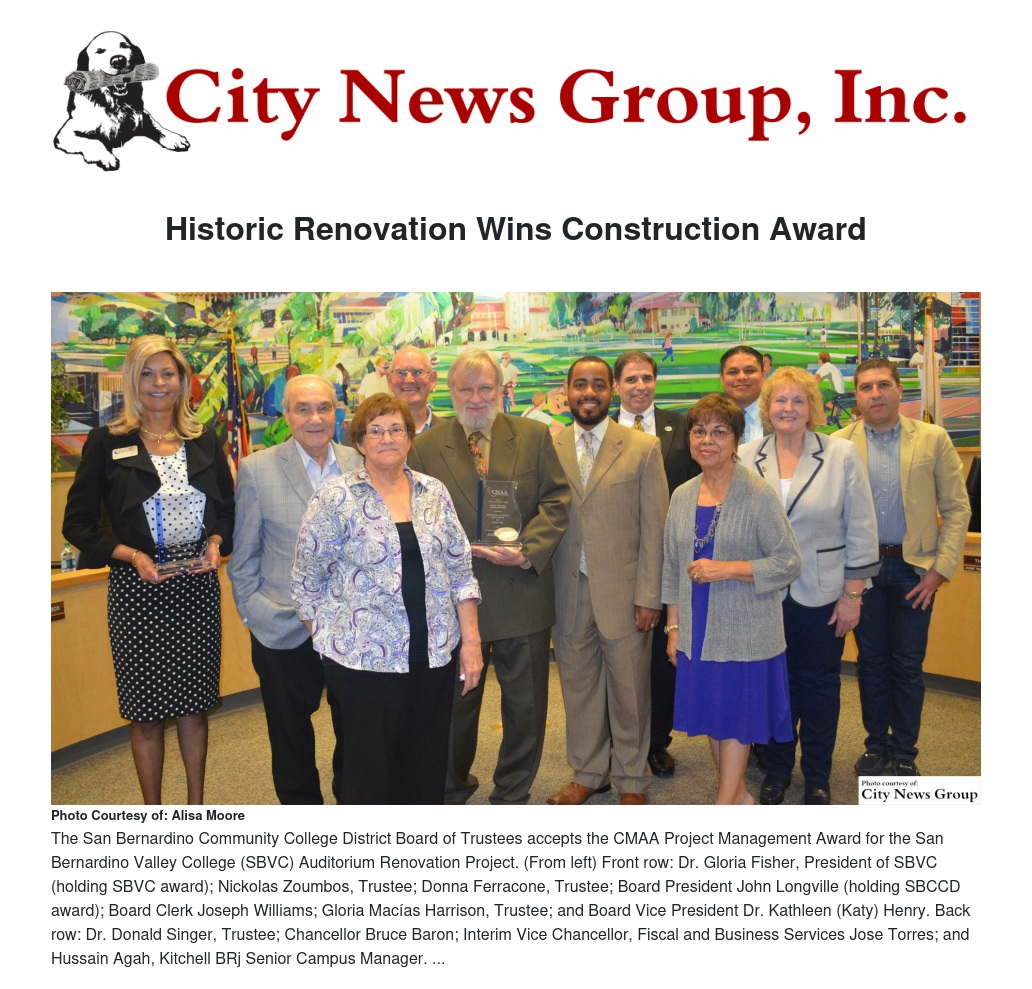 The San Bernardino Community College District (SBCCD) and San Bernardino Valley College received the Project Management Award for the renovation of the San Bernardino Valley College Auditorium from the Southern California Chapter of the Construction Management Association of America (CMAA). The award was presented to the SBCCD Board of Trustees at the May 28 board meeting by Hussain Agah, Senior Campus Manager with Kitchell/BRj, which oversaw the construction project.