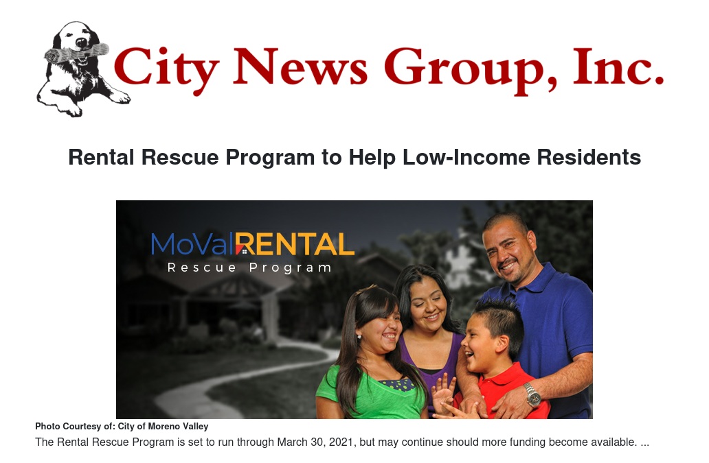 Rental Rescue assistance is reserved for Moreno Valley residents who can document a loss of income due to coronavirus, and whose household income does not exceed 50 percent of the Riverside County Average Median Income by family size; i.e., does not exceed $37,650 for a family of four. Payments will be made directly to landlords or utility/service providers.
