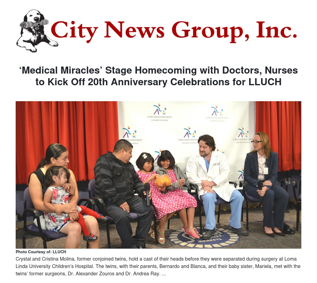 * Crystal and Cristina Molina, 9, of Coachella, former conjoined twins who underwent extensive preoperative care and surgery at LLUCH to separate them from where they were joined at the head. The twins and their parents, Bernardo and Blanca, met with pediatric neurosurgeon Dr. Alexander Zouros and plastic surgeon Dr. Andrea Ray.