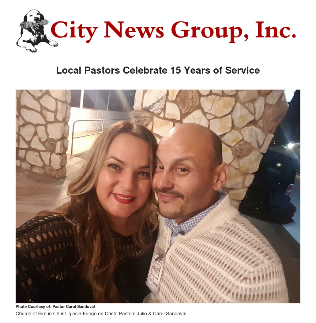 Pastors Julio and Carol Sandoval of Church of Fire in Christ, located in Grand Terrace, are marching into their 15th year of service to God and the community with humility and gratitude.  “It hasn’t always been easy, but it has been worth it!” says Julio.