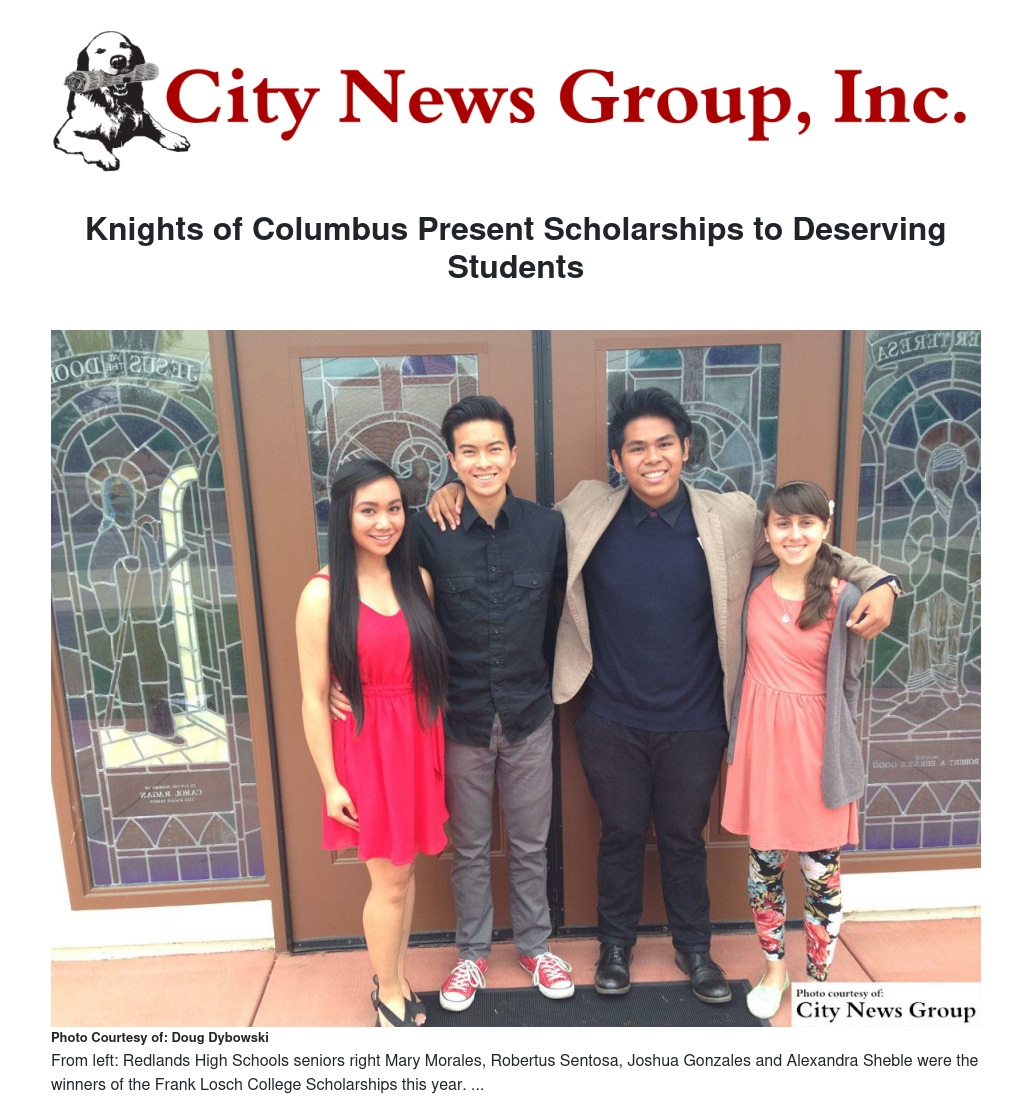 Sunday May 24, the Knights of Columbus of St. Joseph's Catholic Church, Loma Linda presented the Frank Losch College Scholarships to four deserving Redlands High School seniors after the 11:30 a.m. Mass.