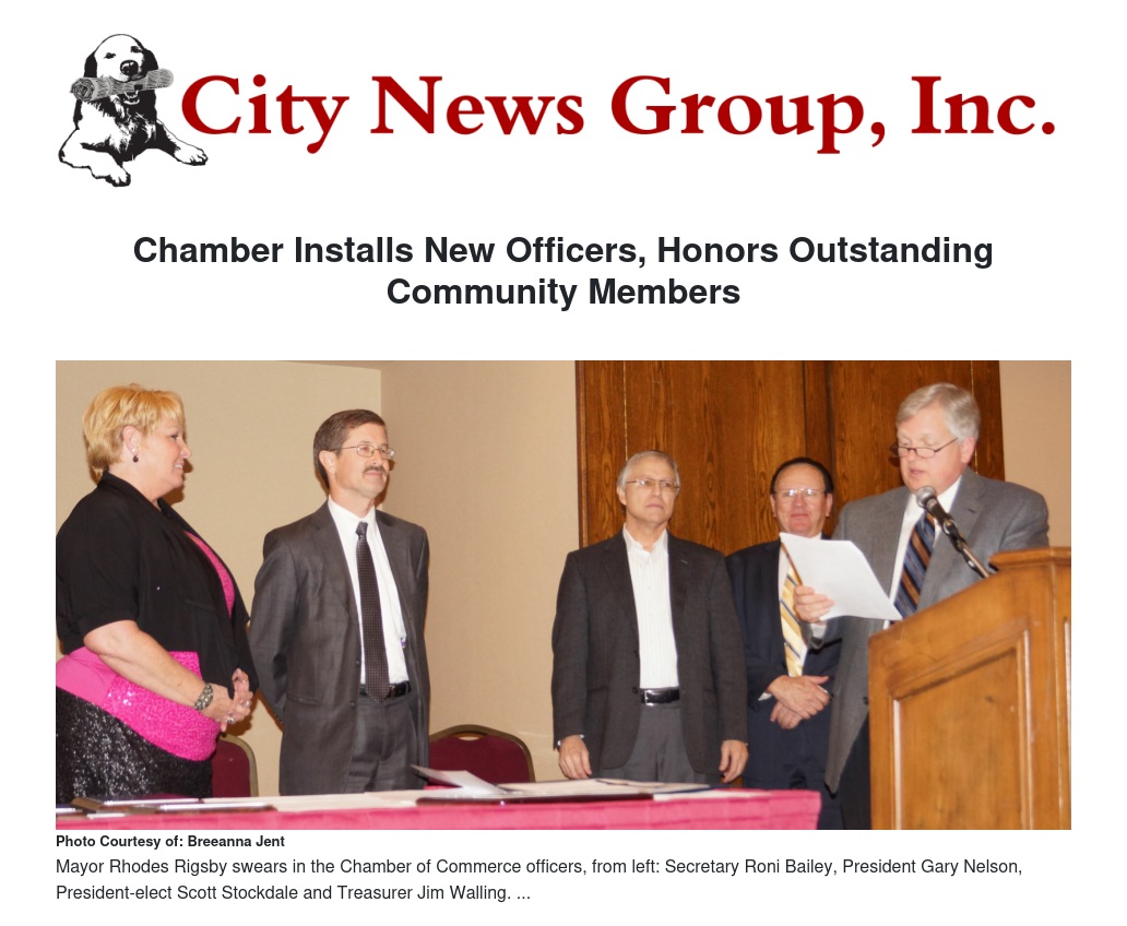 Rigsby swore in the chamber's 2014 board members and its officers: Gary Nelson, president; Scott Stockdale, president-elect; Roni Bailey, secretary; James Walling, treasurer; Danny Fontura, Luke Kibler, Elsie Chan, George Macias, Victor Miller, Margie Miller, Richard A. Schaefer, Bill Arnold, Angela Lalas, BJ Rhoads and Verne Miller; and recognized its directors emeritus: Norm Meyer, John Ruffcorn, Willard Stewart and Mel Upp.