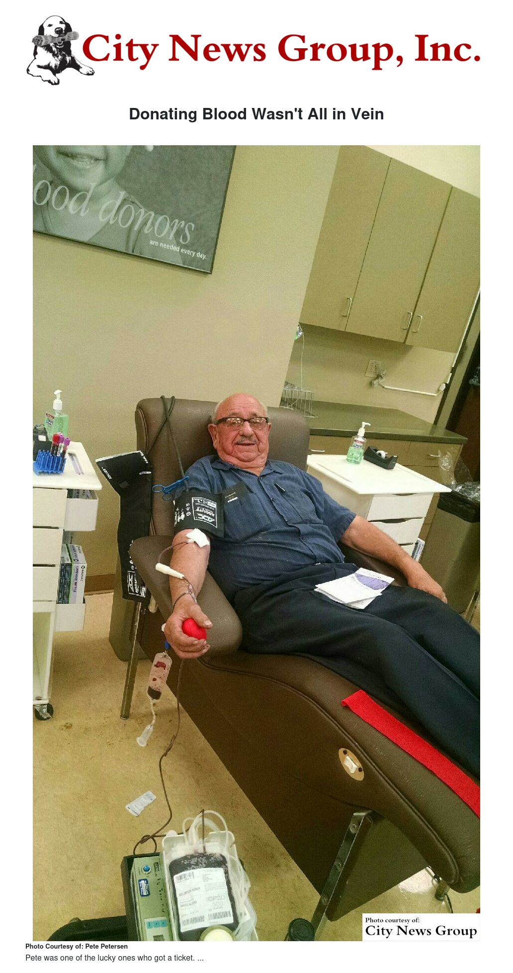 Pete Petersen, an 84 year old Grand Terrace resident made his 97th trip to the San Bernardino Blood Bank and was excited to receive a free ticket to the Airfest. Pete often donates blood as a memorial request of his friend, Jack Russell, who said “Donate blood in my honor” but the ticket to the airshow was an extra bonus for Pete.