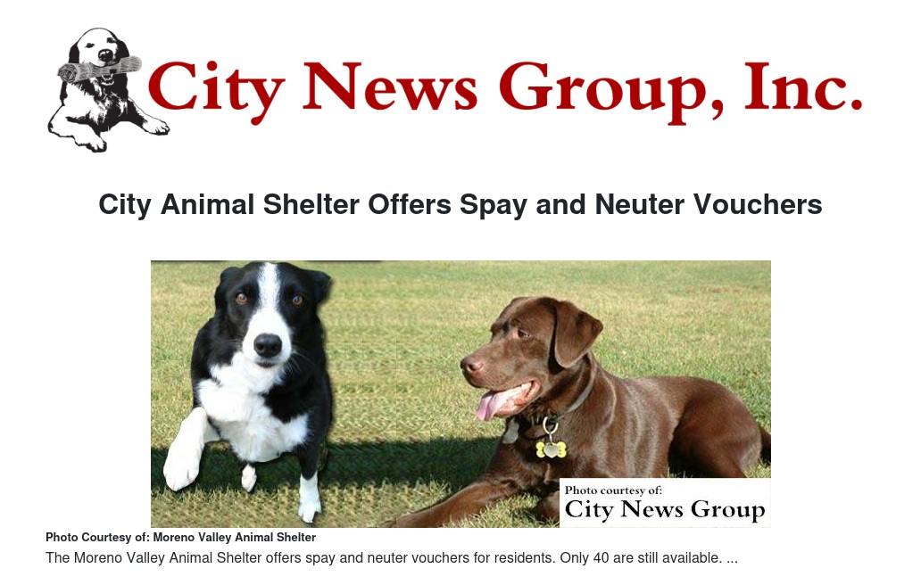MORENO VALLEY >> The Moreno Valley Animal Shelter has only 40 free spay and neuter vouchers remaining to Moreno Valley residents who own a dog or cat and would like to have their pet fixed for free. The remaining 40 vouchers will be distributed on a first-come, first-serve basis at the Animal Shelter.