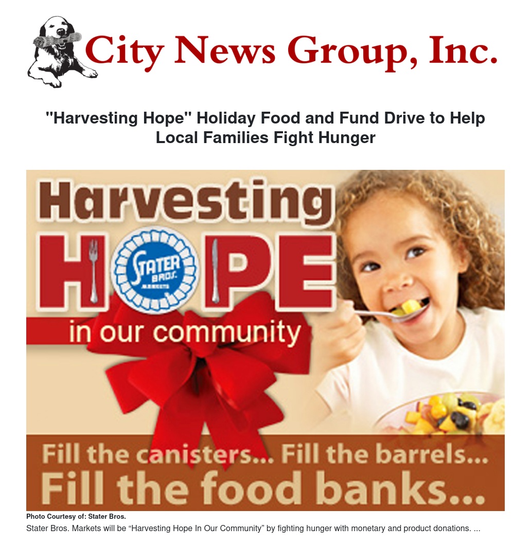 Stater Bros. Markets, in conjunction with its charitable arm Stater Bros. Charities, will be “Harvesting Hope In Our Community” throughout the months of November and December.