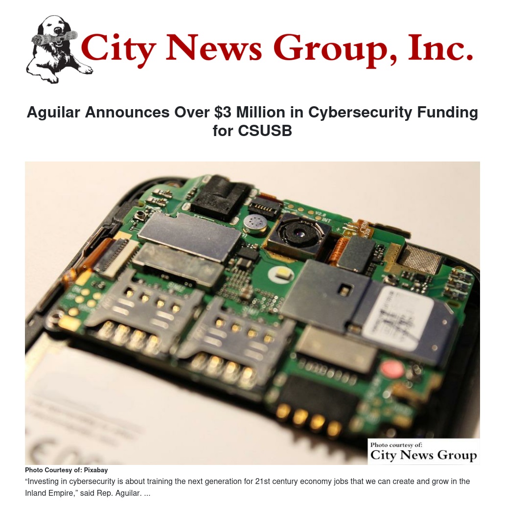 “Investing in cybersecurity is about training the next generation for 21st century economy jobs that we can create and grow in the Inland Empire,” said Rep. Aguilar. He continued, “Supporting programs like those offered at CSUSB allows us to have a highly skilled workforce to enhance our national security, while also putting San Bernardino on the map for education and innovation. These are investments in our national security and regional economy that we need to fight for.”