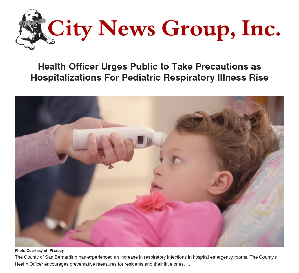 Due to an increase in pediatric hospitalizations and daily emergency room visits for respiratory infections, the County Health Officer strongly encourages San Bernardino County residents to follow preventive measures.