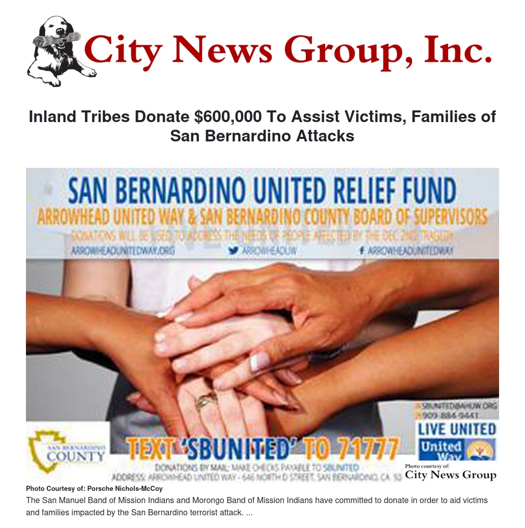 With the contribution by the two tribes, $1 million has been donated to the San Bernardino United Relief Fund created by the Arrowhead United Way to provide support for those affected by the Dec. 2 tragedy at the Inland Regional Center in San Bernardino.
