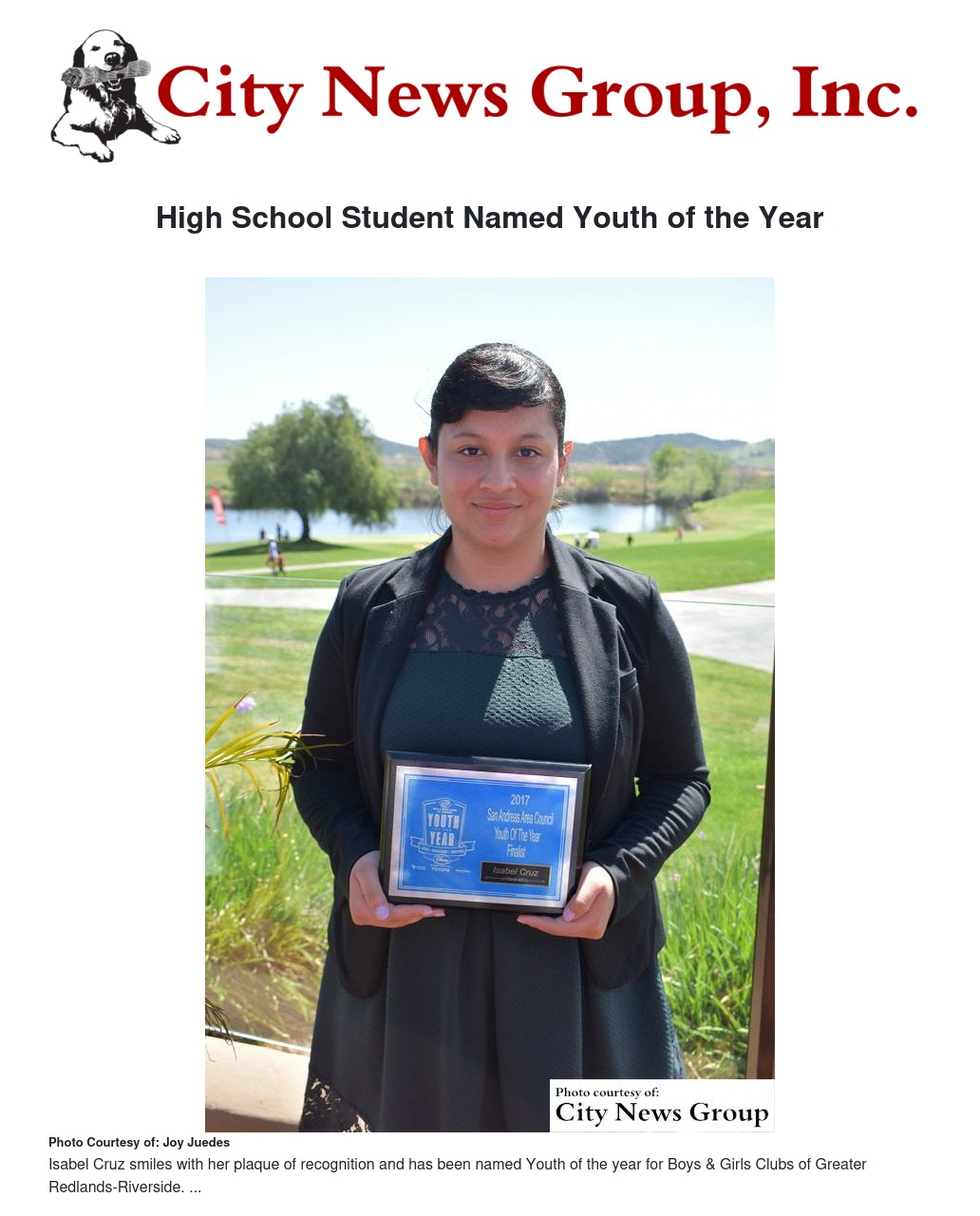 REDLANDS>> Citrus Valley High School Jr., Isabel Cruz, has been named Youth of the Year for Boys & Girls Clubs of Greater Redlands-Riverside.