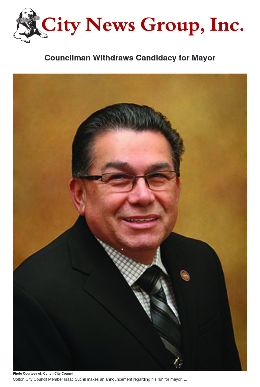 "I am deeply committed to my hometown of Colton. The leadership I provide as Councilman will not be undeterred with this personal decision to withdraw my name from the candidacy for Mayor. I enjoy my responsibilities as Councilman and the unique skill set I bring to District 6 in leveraging more services to business and residents within the community," said Councilman Suchil.
