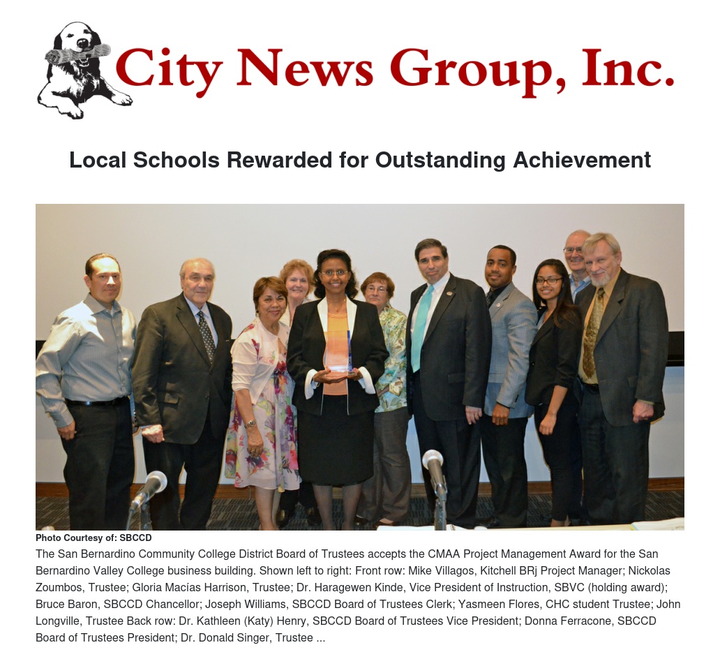 The San Bernardino Community College District (SBCCD) and San Bernardino Valley College received the Project Management Award for the renovation of the San Bernardino Valley College business building from the Southern California Chapter of the Construction Management Association of America (CMAA). The construction began in June 2012 and was completed in April, 2013.
