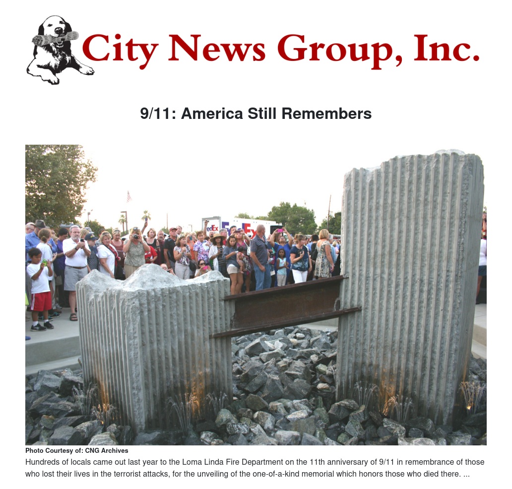 Last year the City of Loma Linda and residents from surrounding communities gathered together just outside the City of Loma Linda Fire Department on Loma Linda Drive on the evening of the 11th anniversary of the attacks to dedicate a relic from that fateful day; today a memorial containing a steel beam once belonging to the buildings at the World Trade Center recovered at Ground Zero stands in Loma Linda as a physical reminder of that day.