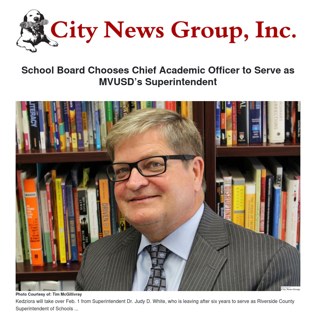 Kedziora will take over Wednesday, Feb. 1 from Superintendent Dr. Judy D. White, who is leaving after six years to serve as Riverside County Superintendent of Schools.