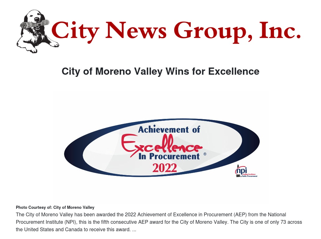 The City of Moreno Valley has been awarded the 2022 Achievement of Excellence in Procurement (AEP) from the National Procurement Institute (NPI). This award honors public and non-profit agencies that have demonstrated continued excellence, innovation, transparency, and best practices in public procurement.